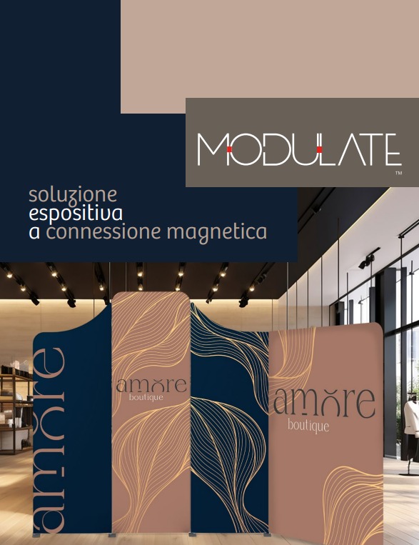 Oltre all’elevato grado di personalizzazione che consente di realizzare stands su misura, questo sistema di allestimento si fa apprezzare per il ridottissimo impatto visivo del telaio di alluminio che risulta quasi totalmente rivestito dalla grafica e che in caso di affiancamento di più moduli non presenta interruzioni per la grafica.